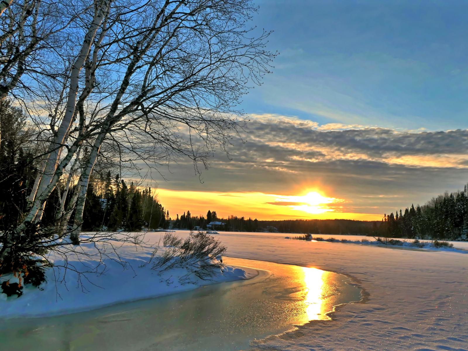 Обои Березы на берегу покрытой льдом реки на закате солнца зимой