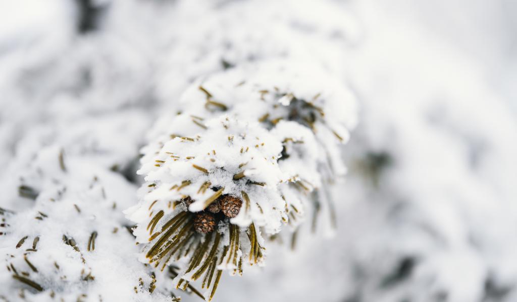 Обои Зеленая ветка сосны покрыта белым холодным снегом