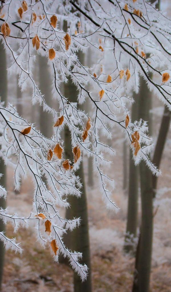 Обои Покрытые инеем ветки дерева на голубом фоне