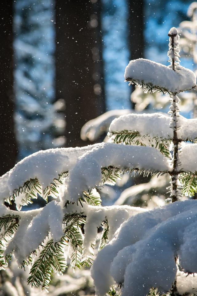 Обои Зеленая покрытая белым снегом ель зимой