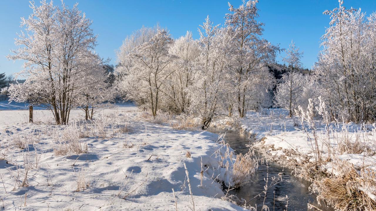 Обои Покрытые инеем деревья в лесу у реки