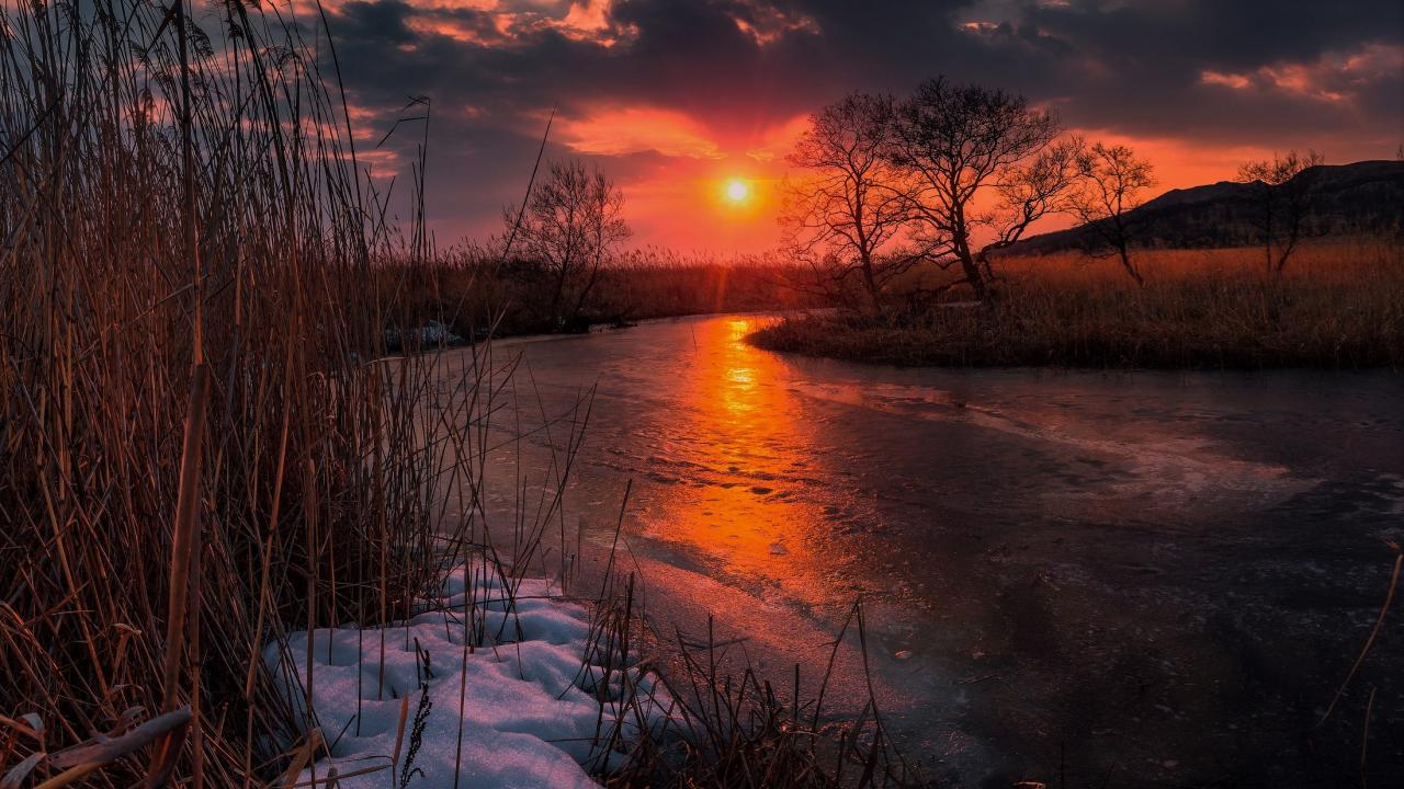 Обои Розовый закат солнца над заснеженными горами и покрытым льдом озером