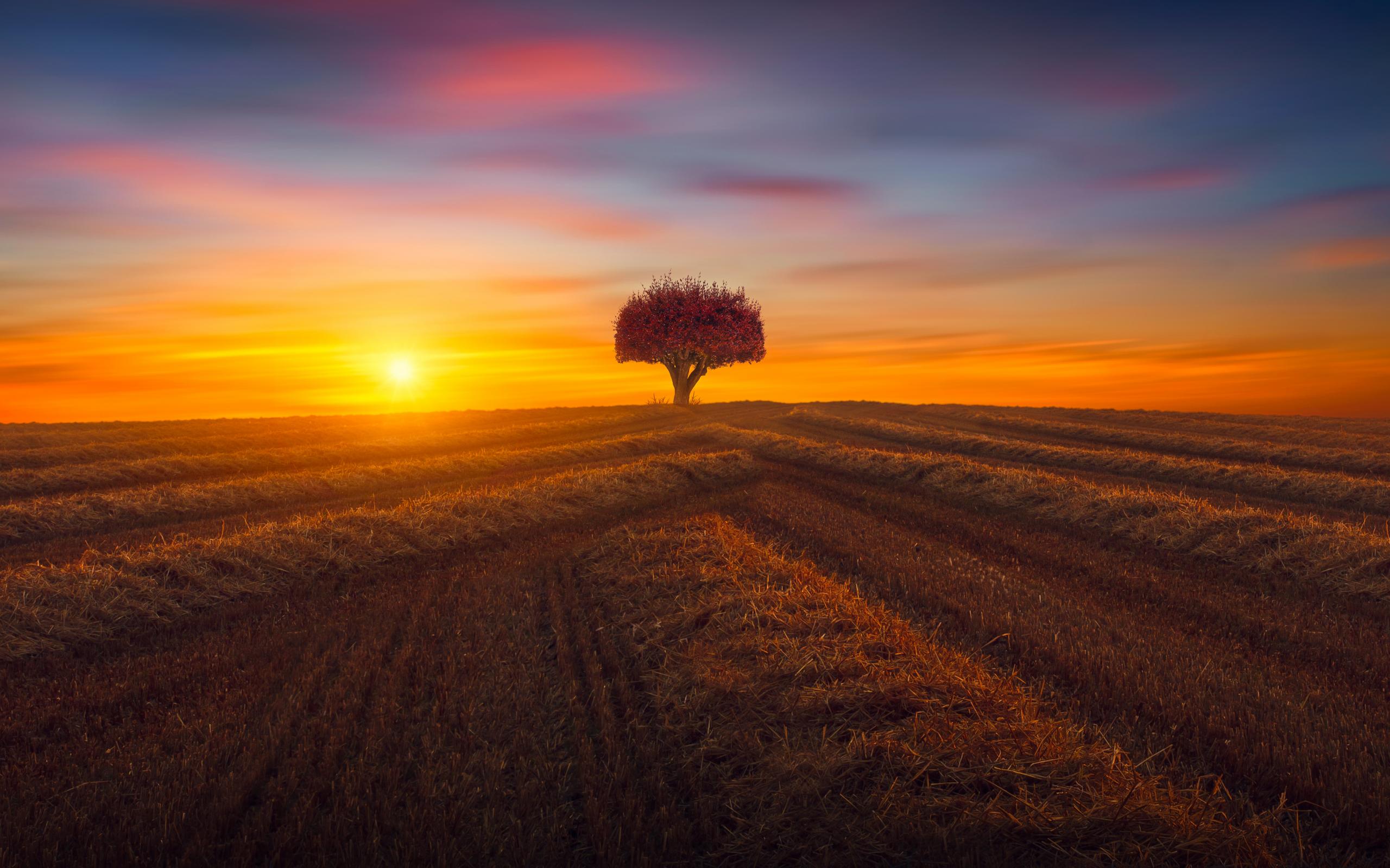 Обои Закат солнца над полем с одиноким деревом осенью