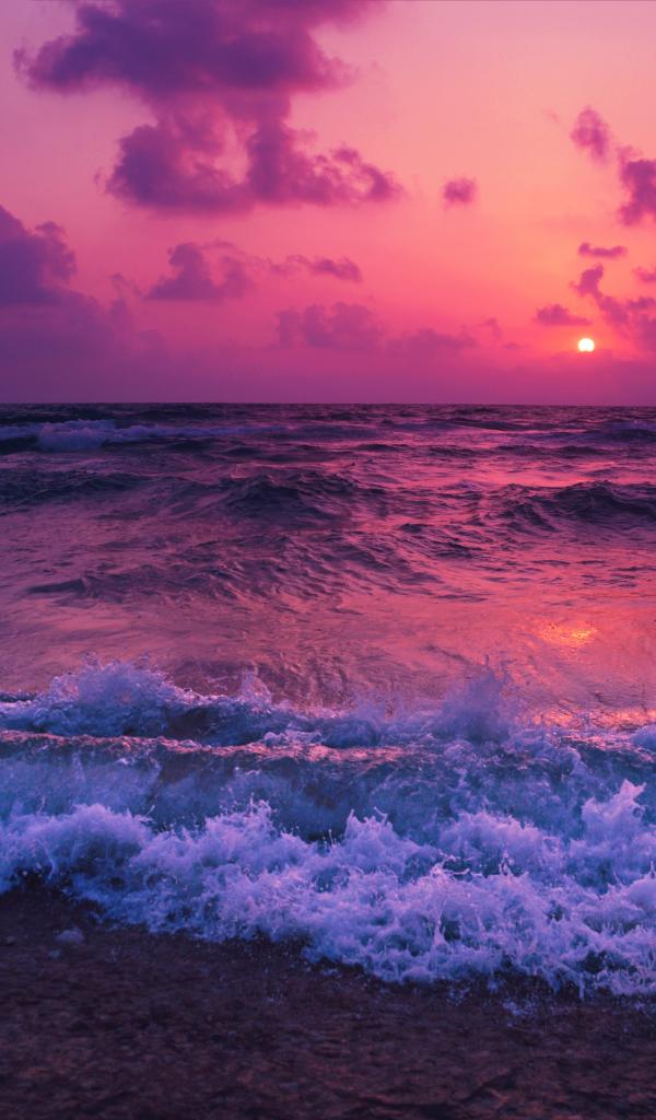 Обои Бушующие волны на берегу на фоне фиолетового закате