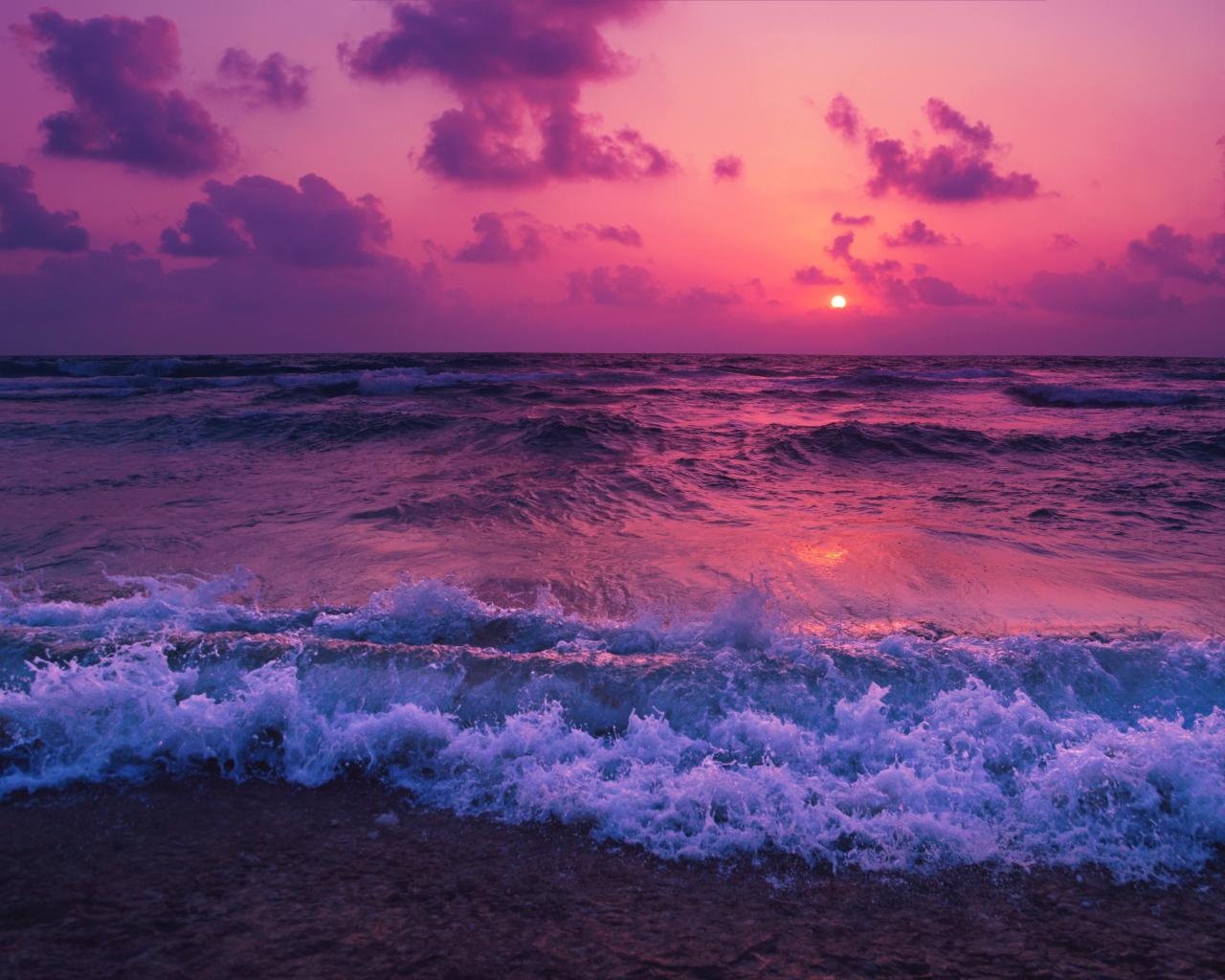 Обои Бушующие волны на берегу на фоне фиолетового закате