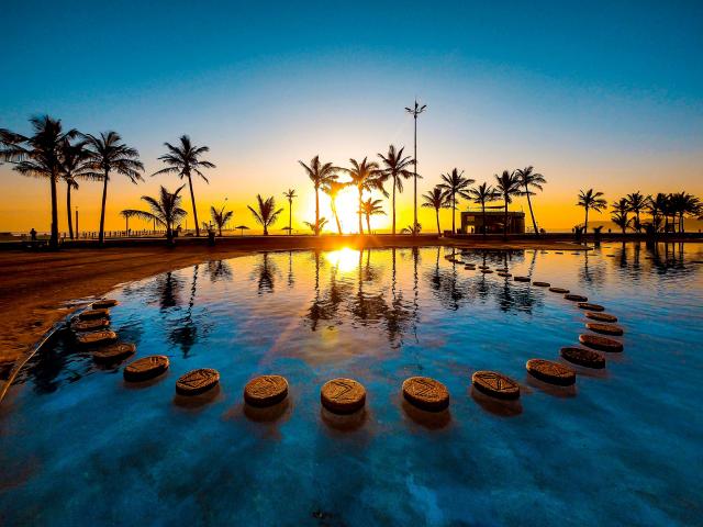 Обои Закат солнца на тропическом пляже на фоне бассейна
