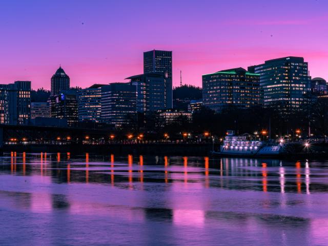 Обои Сиреневый закат над ночным городом у реки