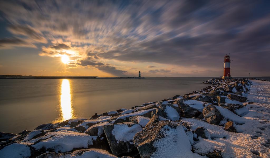 Обои Заснеженные камни на берегу моря с маяком на закате