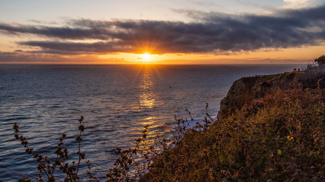 Обои Вид на закат солнца в темных облаках в небе над морем