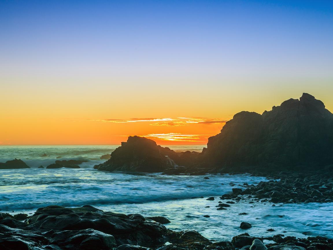 Обои Закат солнца над океаном с камнями на берегу