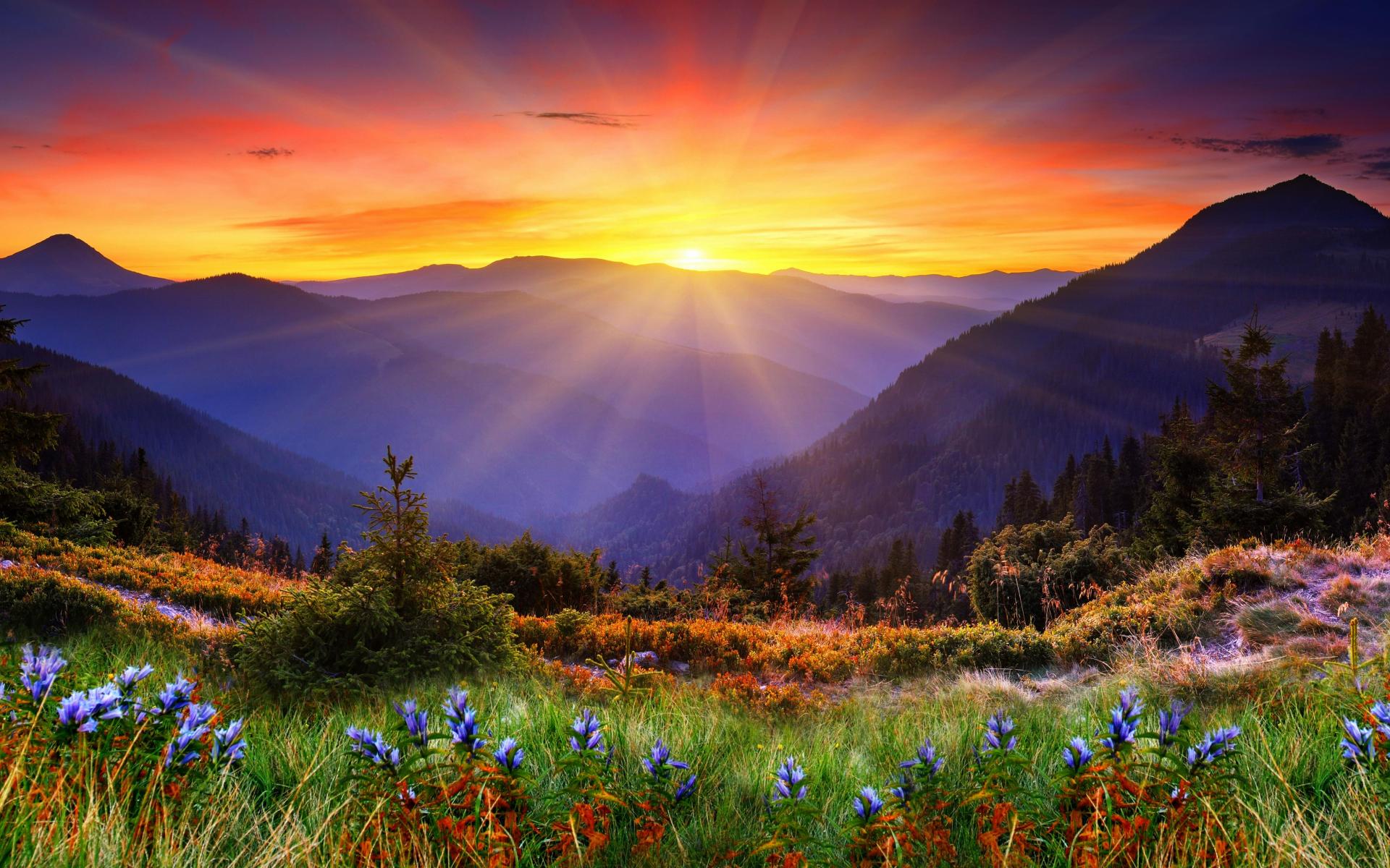 Обои Яркое солнце покрывает вершины гор и красивую природу