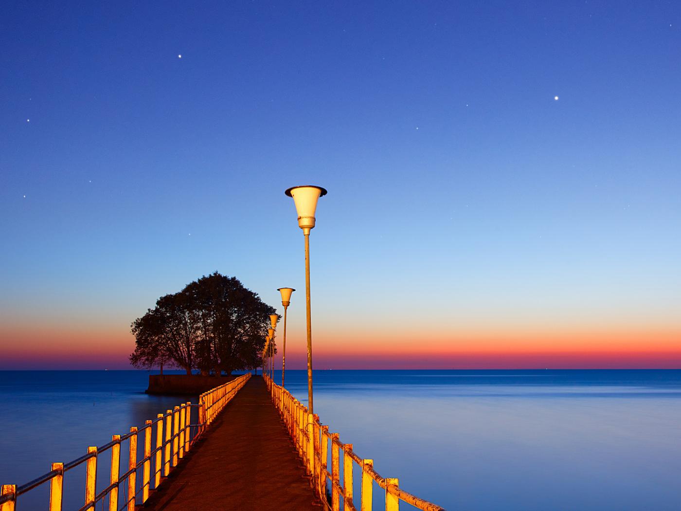 Обои Мост в фонарями в море на закате