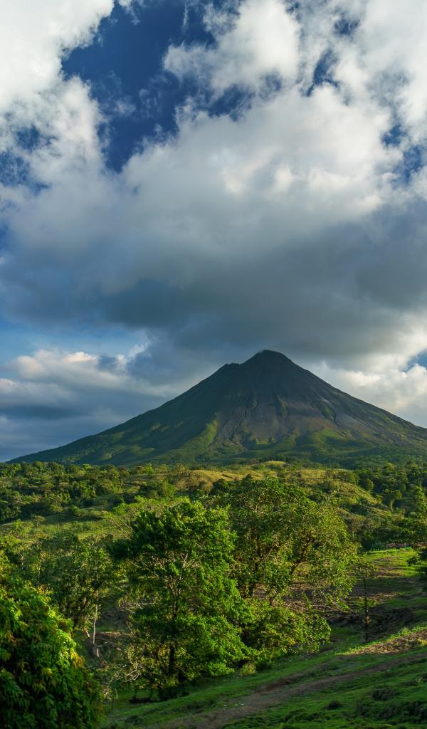 Обои Зеленый вулкан Ареналь под белыми облаками, Коста Рика