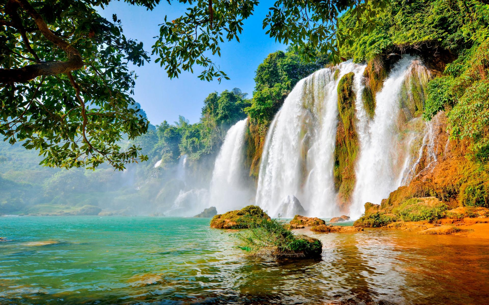 Обои Водопад стекает по скале в озеро