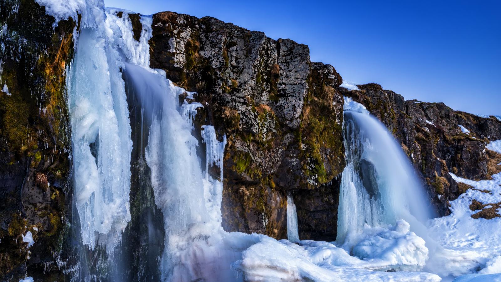 Обои Заледеневший водопад стекает с гор, Исландия