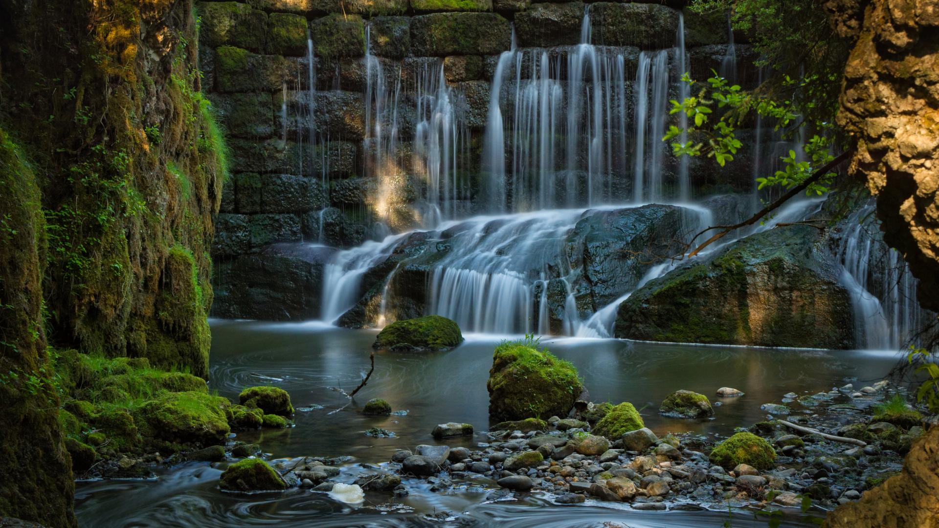 Обои Водопад пробивается сквозь покрытые мхом камни