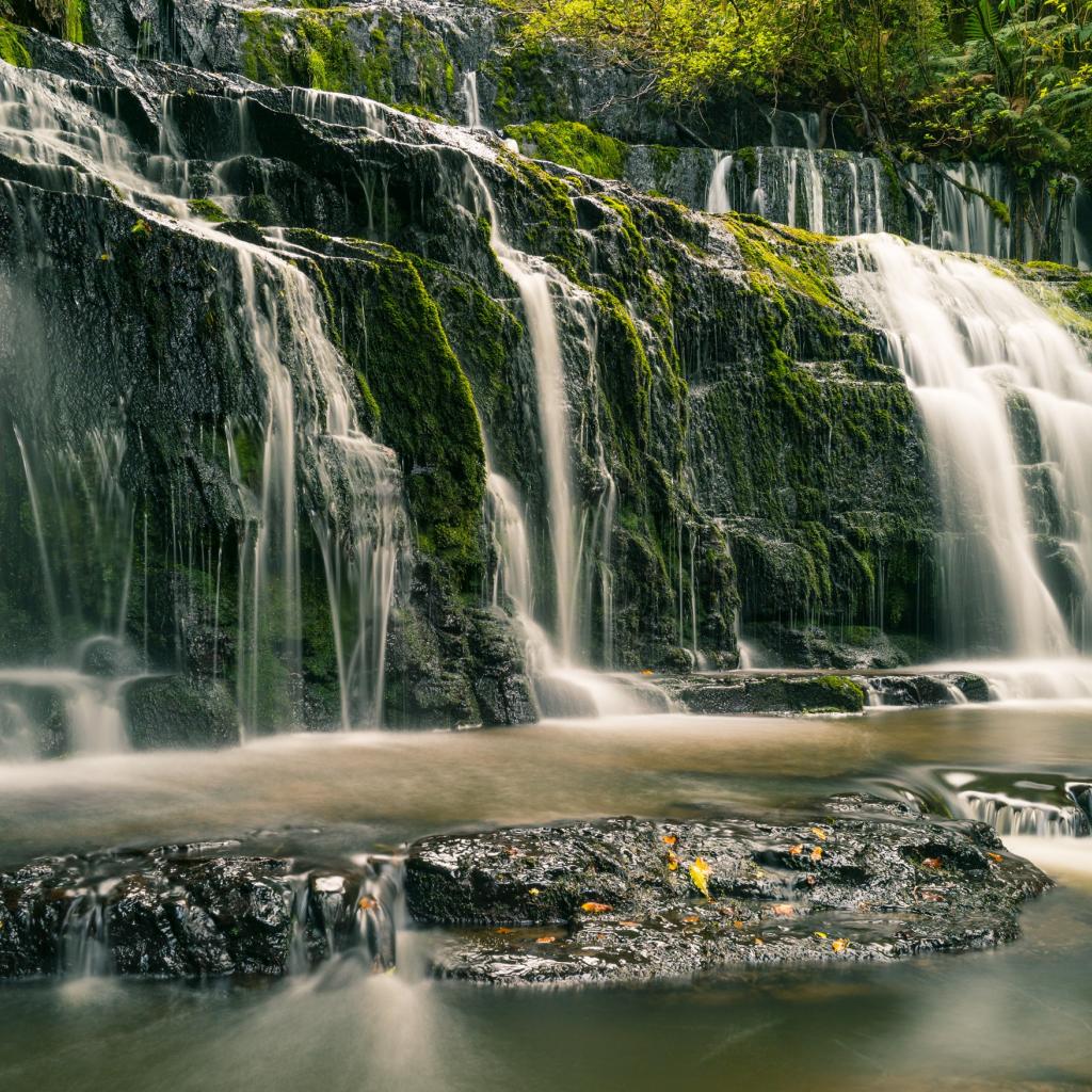Обои Водопад в лесу стекает по покрытым мхом камням