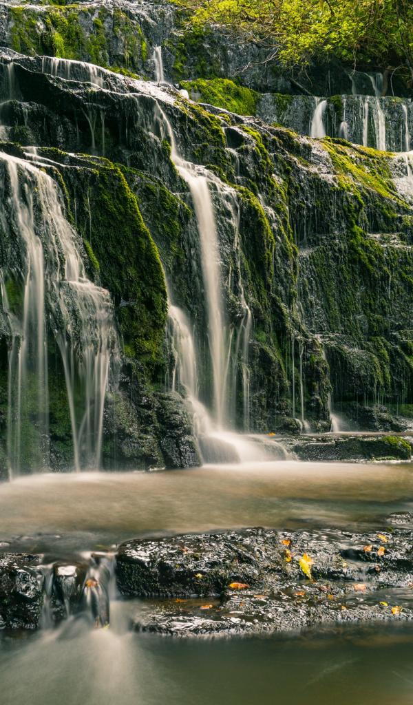 Обои Водопад в лесу стекает по покрытым мхом камням