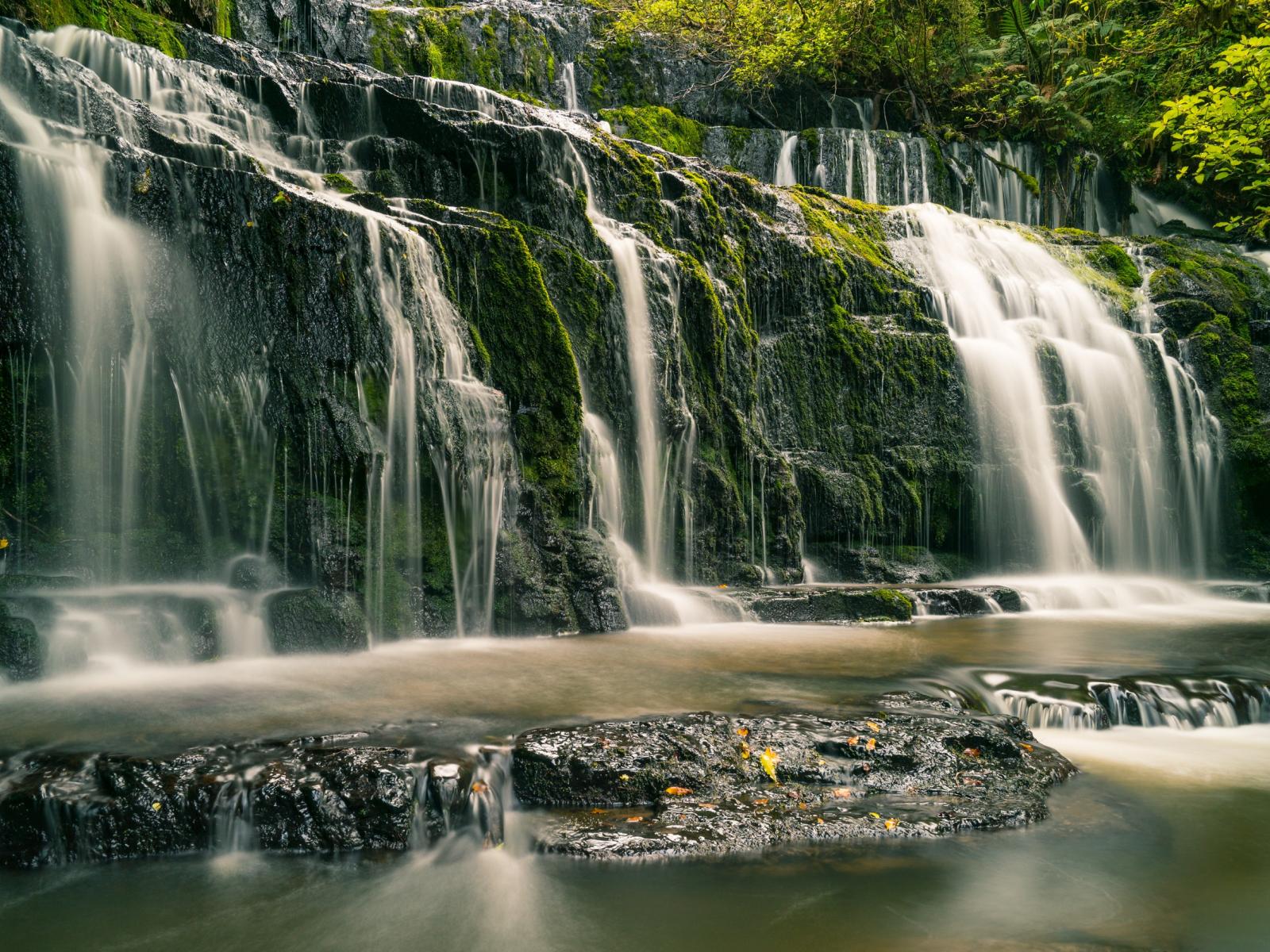 Обои Водопад в лесу стекает по покрытым мхом камням