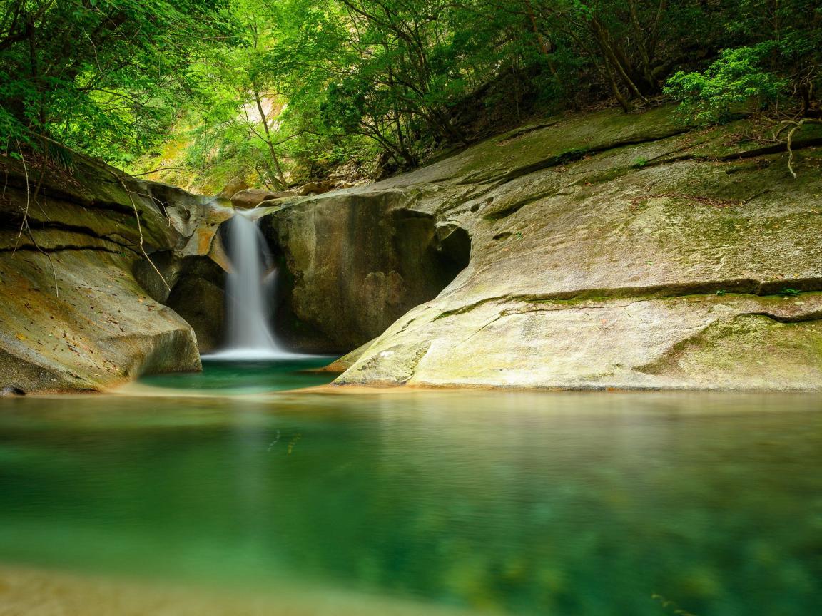 Обои Водопад стекает по скале в озеро в лесу