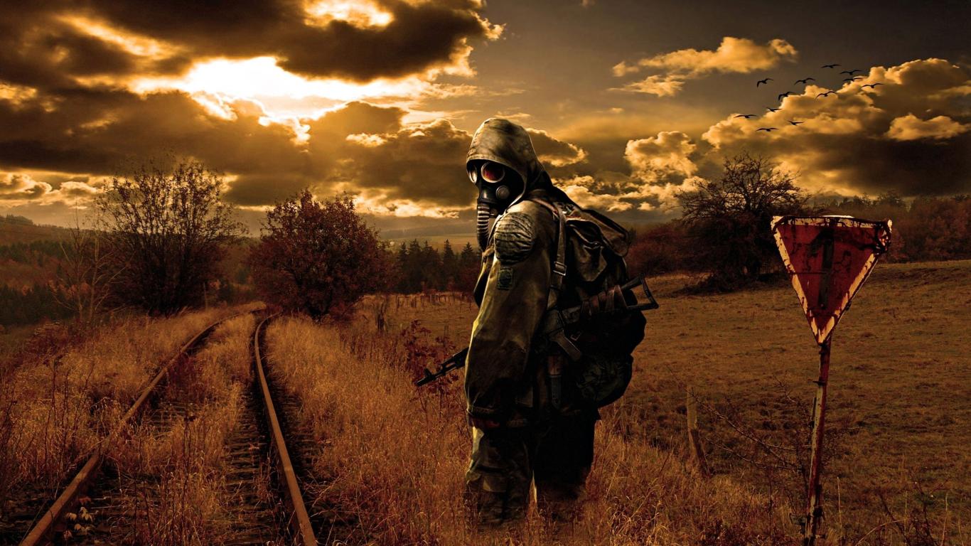 Обои Сталкер в противогазе на рельсах, коронавирус 2020