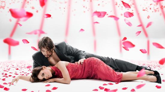 Обои Девушка в красном платье лежит на полу с мужчиной в костюме