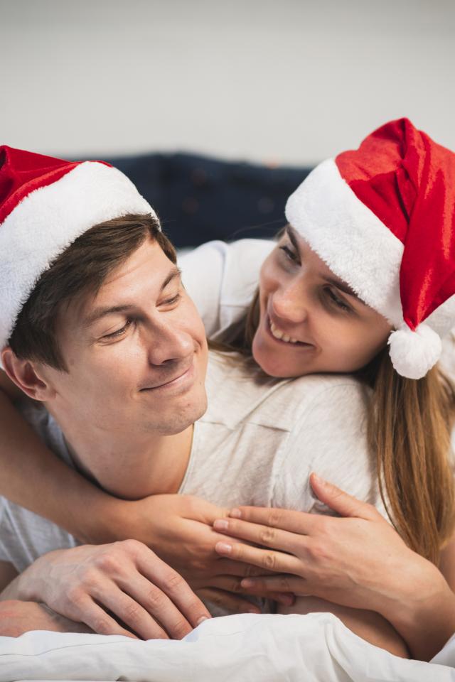 Обои Мужчина и девушка в шапках Санта Клауса лежат на кровати