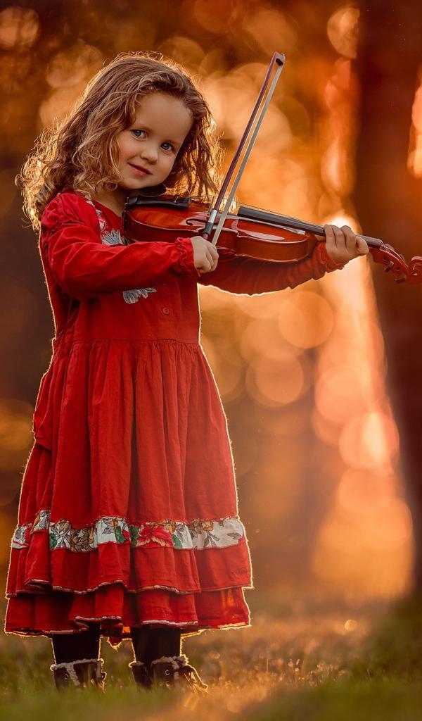 Обои Маленькая девочка в красном платье со скрипкой в руках