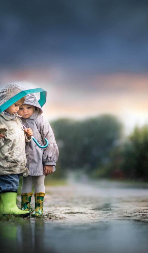 Обои Маленькие мальчик и девочка под зонтом на дороге