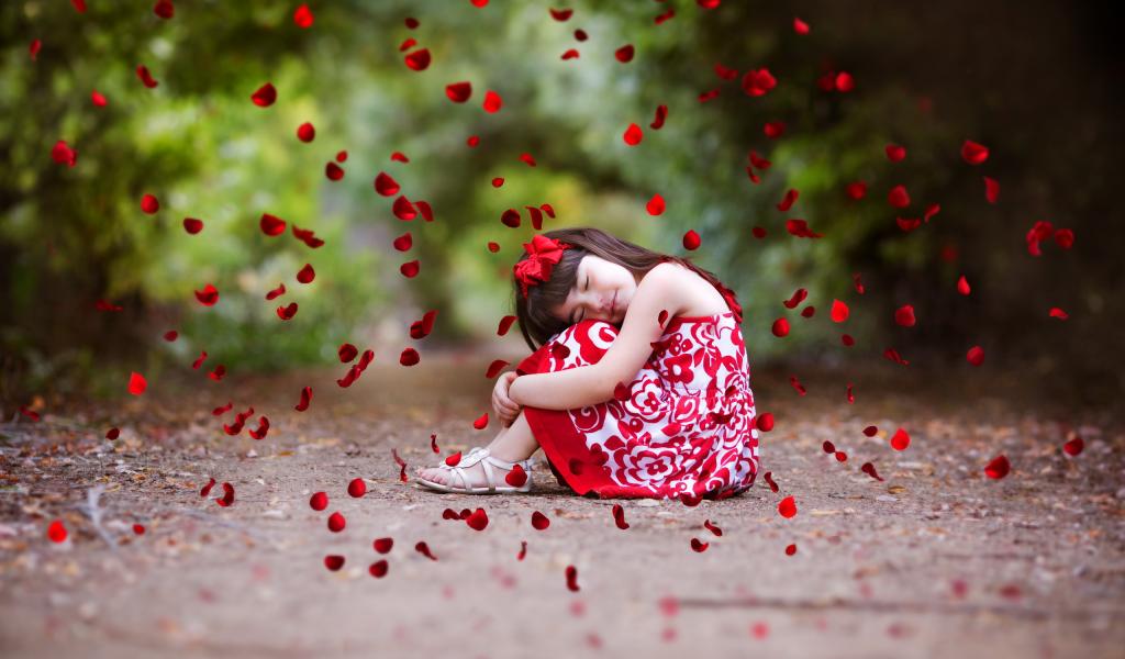Обои Лепестки красной розы падают на маленькую девочку