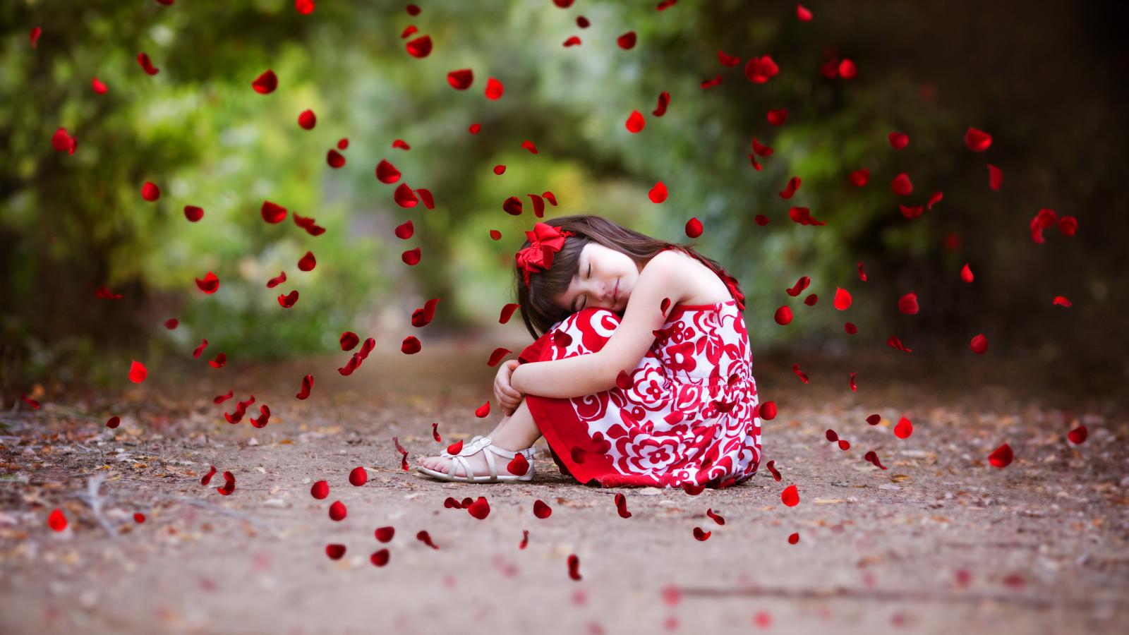 Обои Лепестки красной розы падают на маленькую девочку