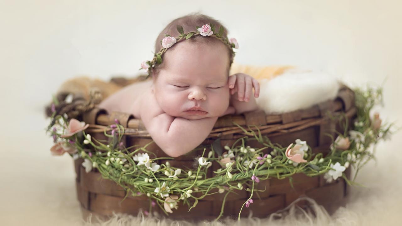 Обои Маленький спящий младенец в корзине