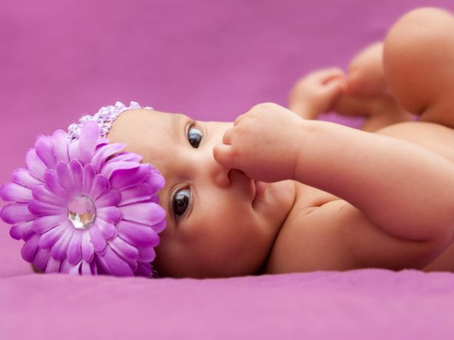 Обои Младенец девочка с большим сиреневым цветком на голове