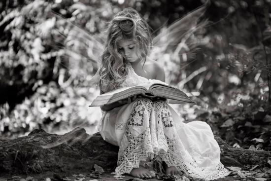 Обои Маленькая девочка в белом платье с книгой, черно- белое фото