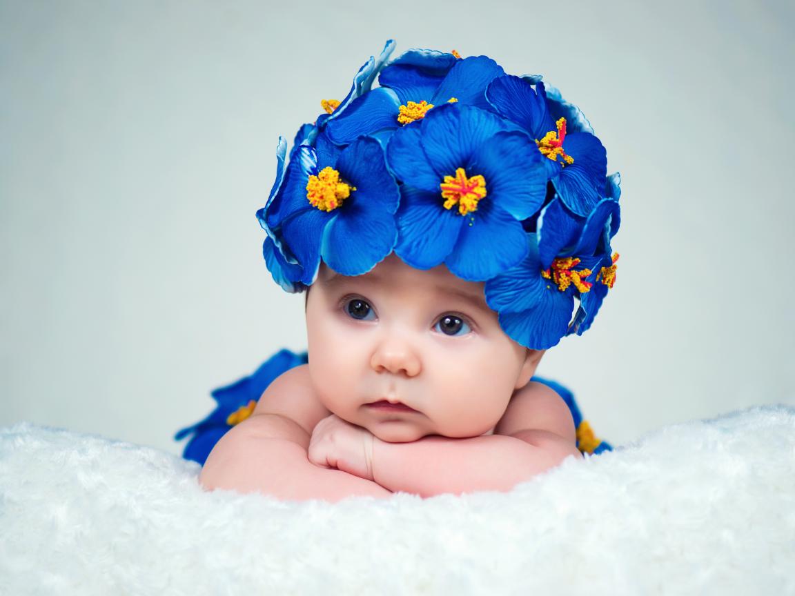 Обои Маленький ребенок в красивой шапке с голубыми цветами