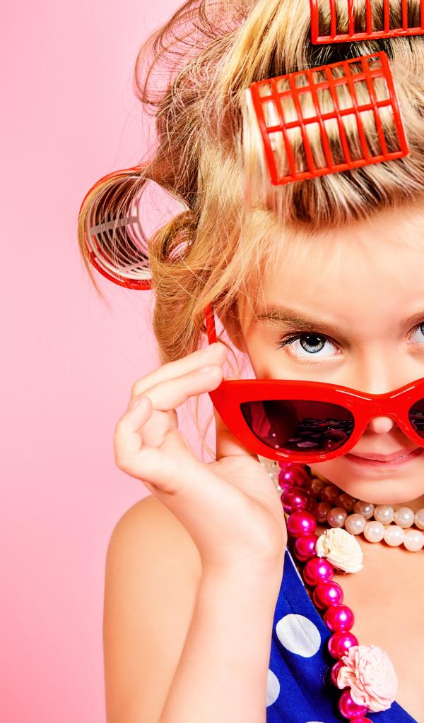 Обои Гламурная девочка в больших красных очках и бигудями на голове