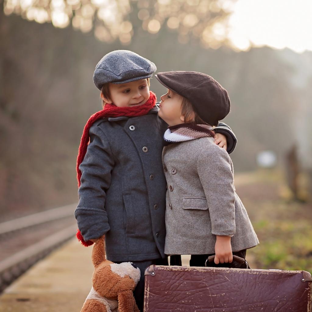 Обои Два мальчика с большим чемоданом у железной дороги