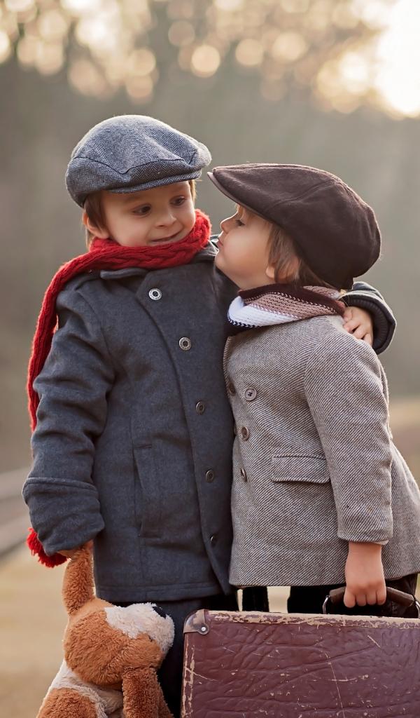 Обои Два мальчика с большим чемоданом у железной дороги