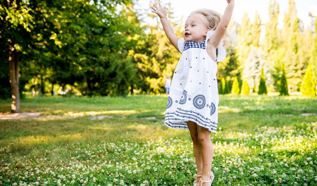 Обои Девочка в красивом платье гуляет на зеленом лугу