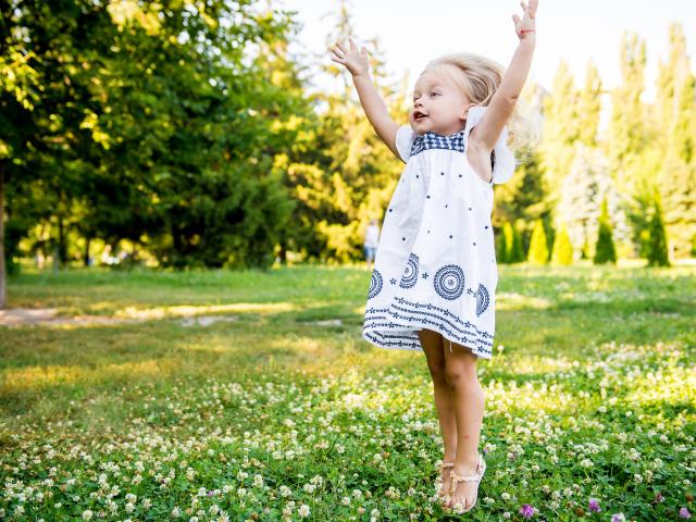 Обои Девочка в красивом платье гуляет на зеленом лугу