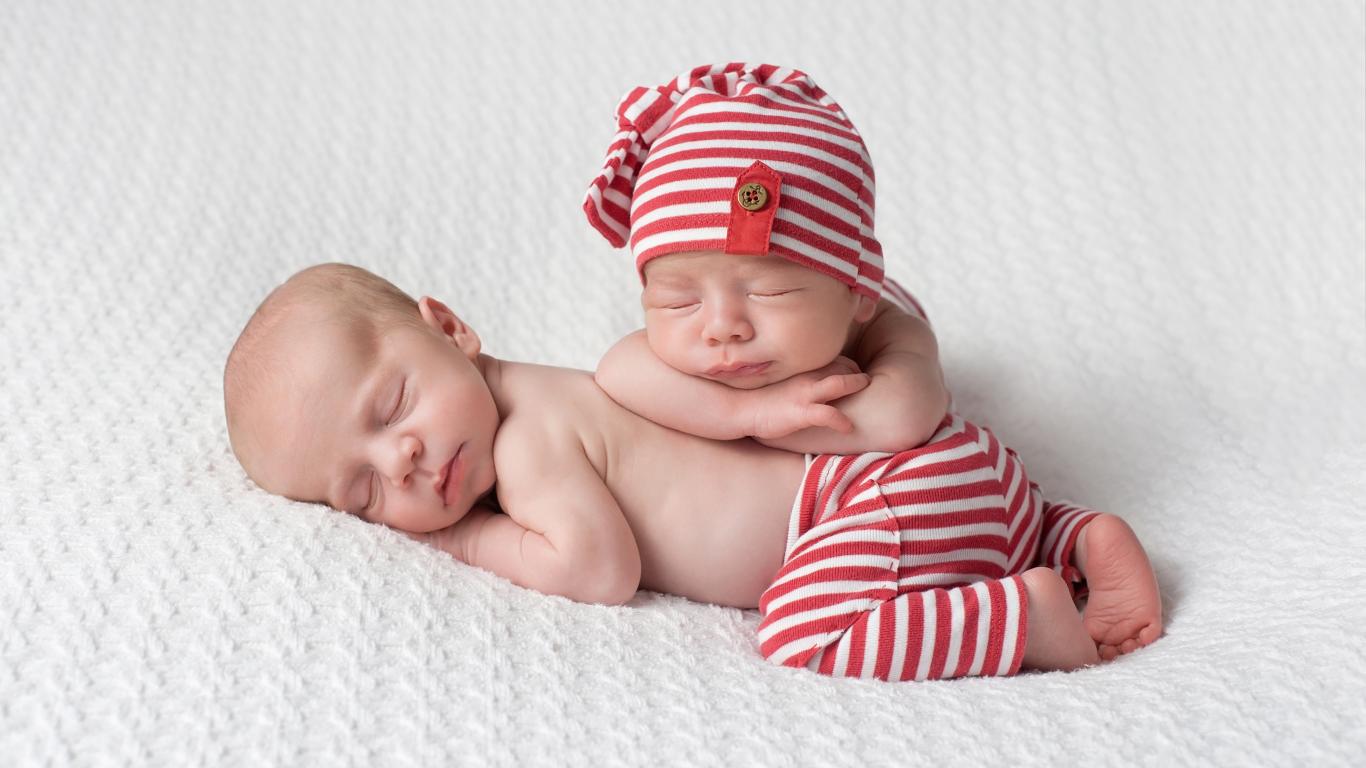 Обои Два милых спящих младенца в полосатых костюмах