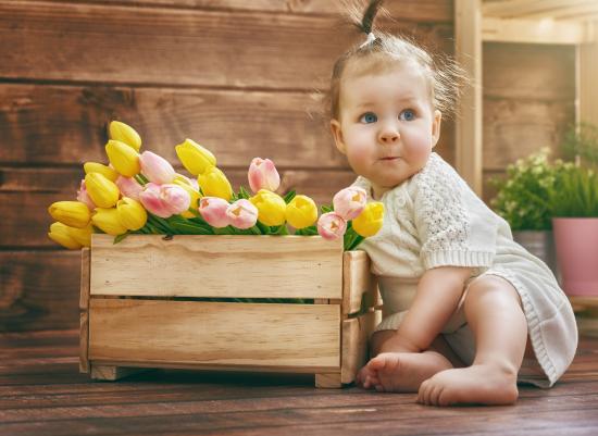 Обои Маленькая забавная девочка с букетом тюльпанов