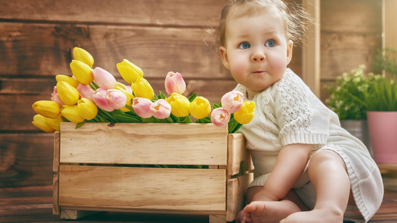 Обои Маленькая забавная девочка с букетом тюльпанов