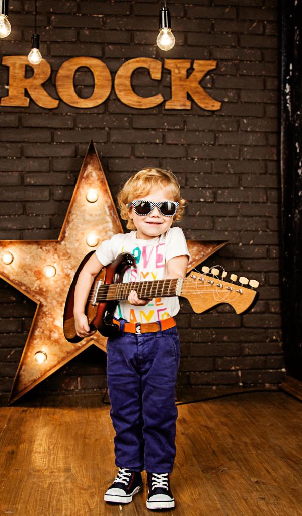 Обои Маленький мальчик в модных очках с гитарой