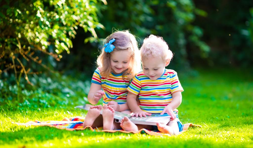 Обои Маленькие мальчик и девочка читают книгу сидя на зеленой траве