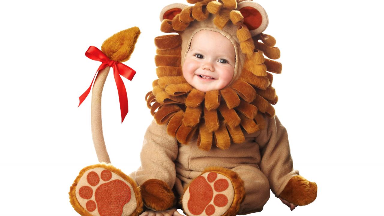 Обои Маленький милый ребенок в костюме львенка на белом фоне
