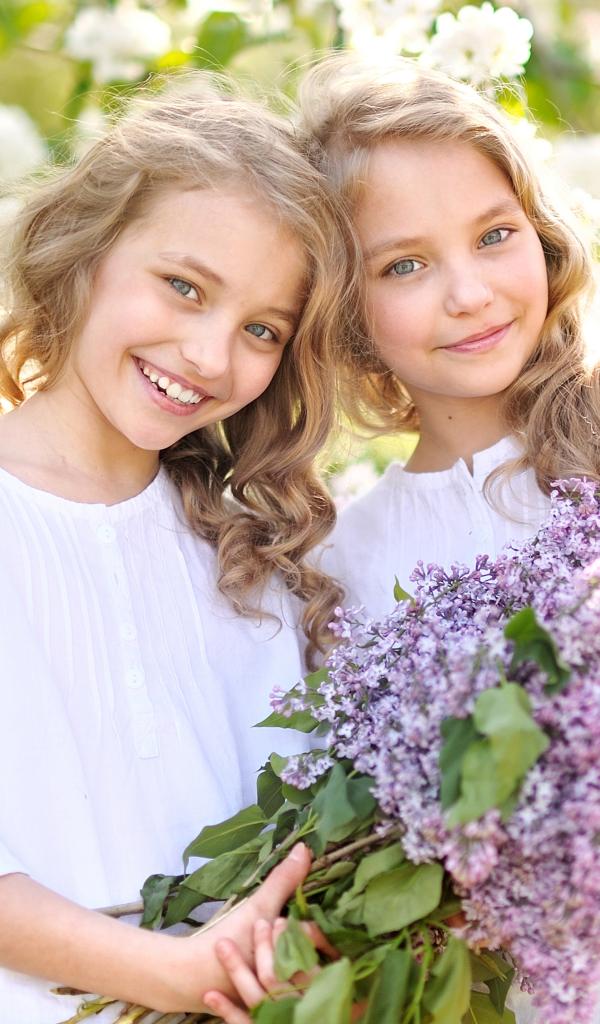 Обои Две улыбающиеся девочки близняшки с букетом сирени