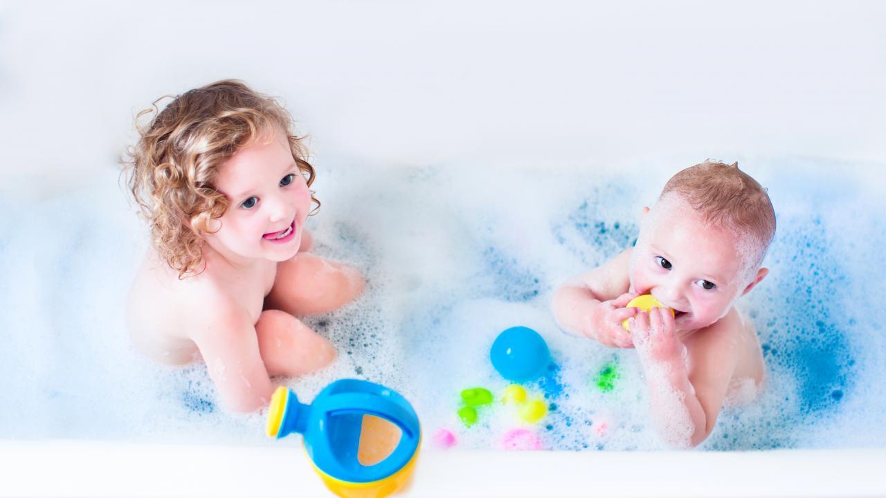 Обои Маленькие мальчик и девочка купаются в ванной с игрушками