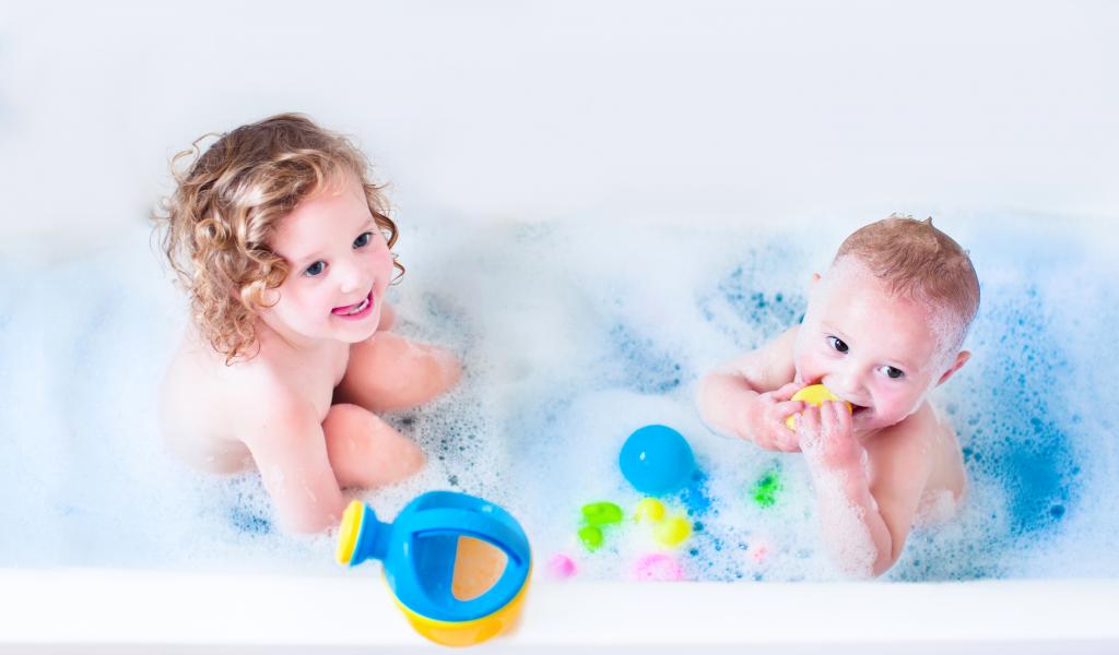 Обои Маленькие мальчик и девочка купаются в ванной с игрушками