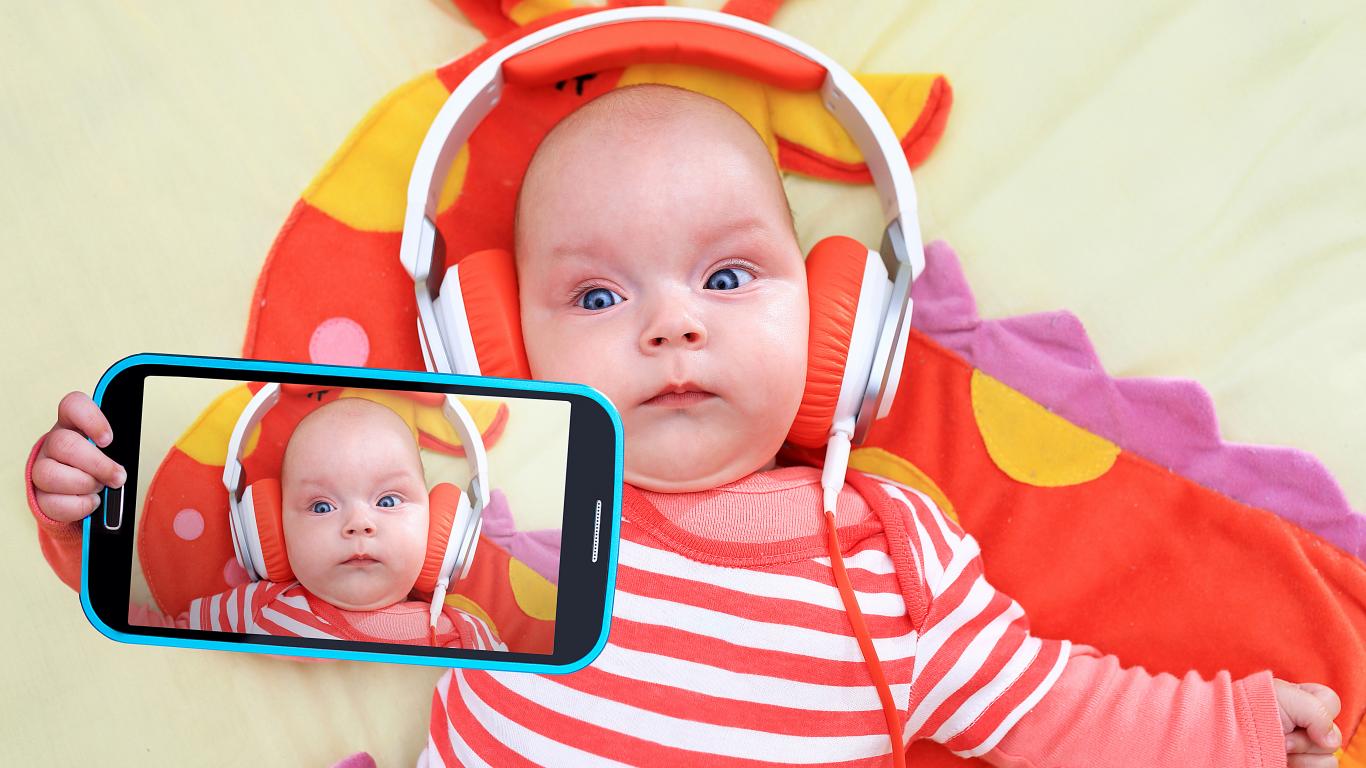 Обои Младенец в оранжевых наушниках делает селфи